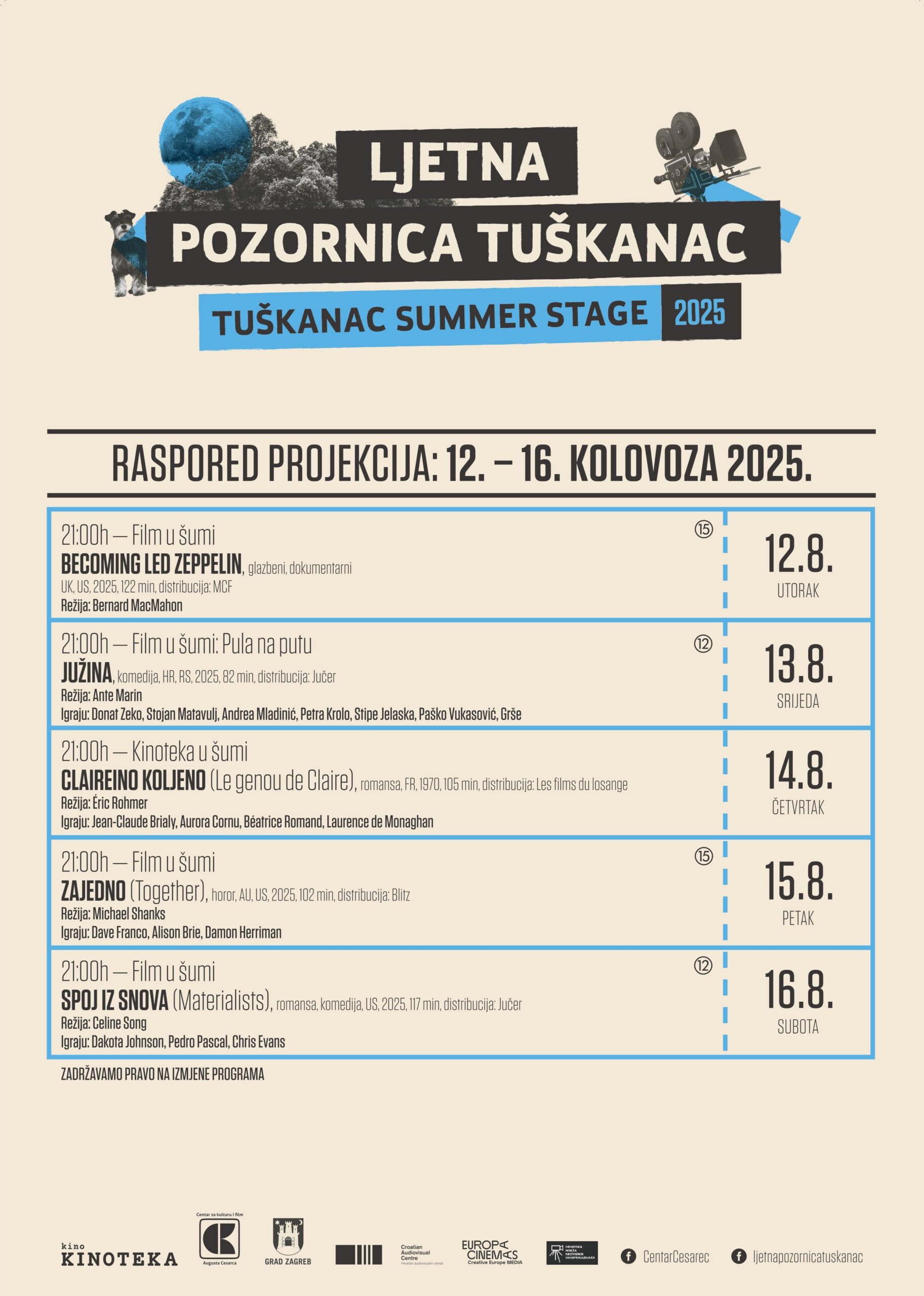 Kolovoz na Ljetnoj pozornici Tuškanac nastavlja se uz Film u šumi, program Centra za kulturu i film Augusta Cesarca, koji na najljepšem zagrebačkom kinu na otvorenom prikazuje izbor aktualnih distribucijskih naslova i klasika sedme umjetnosti. U sljedeća dva tjedna čekaju nas djela čiji autori pronalaze svjež i originalan pristup temama kao što su ljubav i profesionalna posvećenost.
