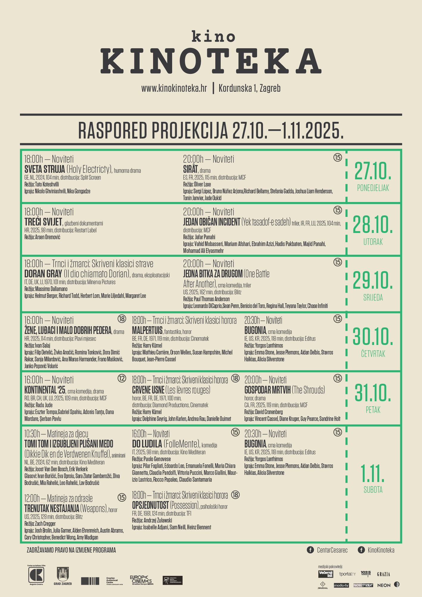 Program zaključuje Opsjednutost, priča o razvodu braka koja dobiva monstruozni obrat u napuštenom stanu kraj Berlinskog zida. Andrzej Żuławski majstorski kombinira horor i psihološku dramu u osebujnu priču o emocionalnom otuđenju, raspadu identiteta i podijeljenoj hladnoratovskoj Europi, a njegovi odjeci vidljivi su u suvremenim radovima i estetikama redatelja poput Arija Astera, Yorgosa Lanthimosa, Roberta Eggersa i Gaspara Noéa.Noviteti: Bugonia Bugonia je nova crna komedija Yorgosa Lanthimosa, u kojoj svoj prepoznatljivi brend apsurdnog i začudnog humora primjenjuje na neuroze današnjeg društva. Priča o dva mladića koji otimaju direktoricu velike tvrtke, uvjereni da je ona izvanzemaljka koja se sprema uništiti čitav planet, premijerno je prikazan na festivalu u Veneciji gdje je oduševio publiku i kritiku, a ispred kamere ponovno se pojavljuju Lanthimosovi sada već stalni suradnici Emma Stone i Jesse Plemons.