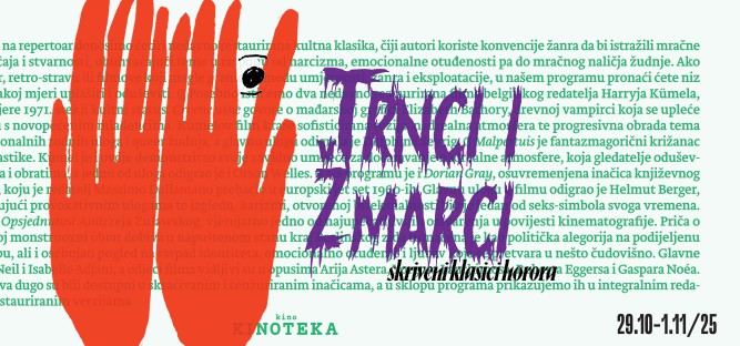 Povodom Noći vještica repertoar kina Kinoteka posvetili smo ljubiteljima horora i mračne fantastike. Očekuju vas četiri nedavno restaurirana kultna klasika, čiji autori koriste konvencije žanra da bi istražili mračne zakutke razuma, osjećaja i stvarnosti, a koji obuhvaćaju teme u rasponu od narcizma, emocionalne otuđenosti pa do mračnog naličja žudnje. Ako volite psihološki horor, retro-stravu ili filmove koji magle granice između umjetnosti, žanra i eksploatacije, u našem programu pronaći ćete niz naslova koji će u jednakoj mjeri uplašiti i oduševiti.
